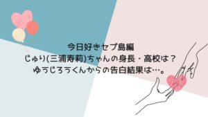 今日好きじゅり(三浦寿莉)ちゃんの身長や高校は?告白の結果は…。【小夏・セブ島編】 今日好きセブ島編に継続メンバーとして出演中のじゅりちゃん。 ゆうじろうくん・こたろうくん・じゅりちゃんが繰り広げる複雑な三角関係はセブ島編の見どころですよね!...