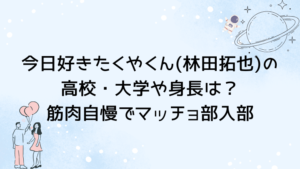 今日好きたくやくん(林田拓也)の高校・大学や身長は?筋肉自慢でマッチョ部入部【冬休み編2024・卒業編2... 今日好き冬休み編2024・卒業編2025inソウルに出演したたくやくん。 今やたくはるカップルとして大人気ですよね。 そんなたくやくんですが、「たくやくんの高校や大学は...